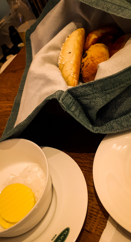 Ludzi było dużo, kelnerzy uwijali się jak mróweczki. Pięknie nakryte stoliczki. Po zamówieniu dostałam starter. Pyszne ciepłe bułeczki z masełkiem do smarowania wszystko elegancko podane. Troszkę pojadłam w oczekiwaniu na sznycelka.  Przyglądając się wyglądowi restauracji i jak pracuje obsługa.